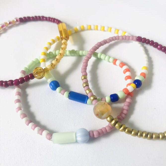 Pretty stretch bead bracelets. Gorgeous stacked on your wrist. They come two per card, and are $45.