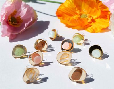 An organic shaped stud earring in gold and pearl striped acrylic and thin gold mirror.