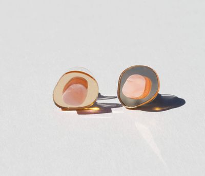 An organic shaped stud earring in peach marbled acrylic and thin gold mirror.