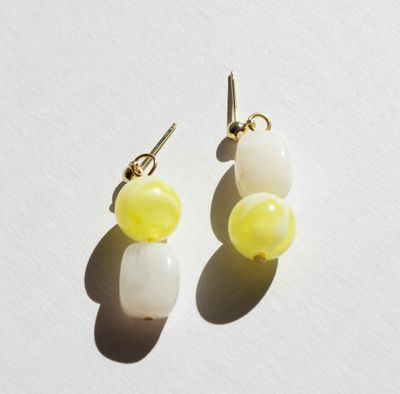 This is a stunning pair of beaded earrings in white and pale yellow acrylic beads with a stunning marbled look.